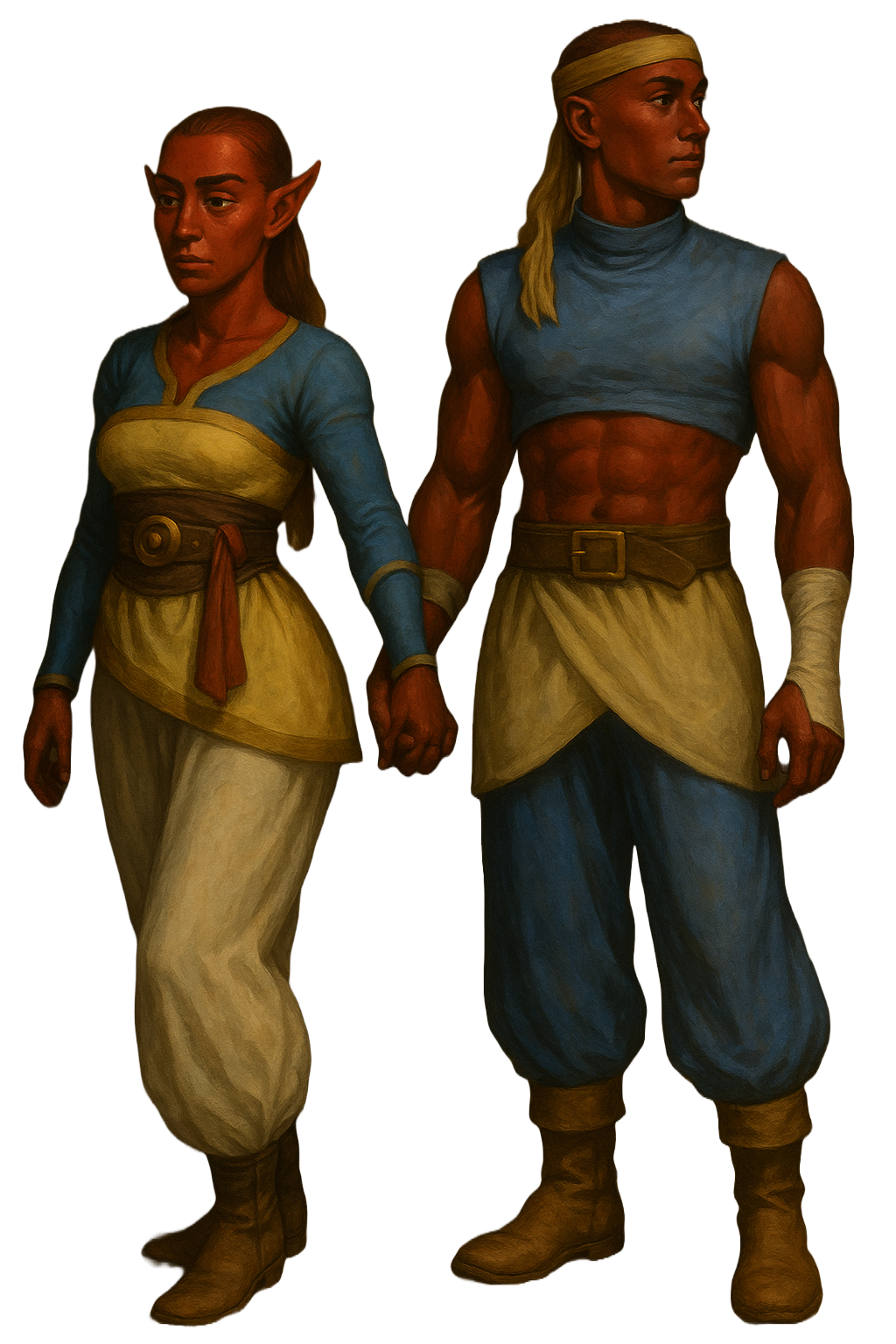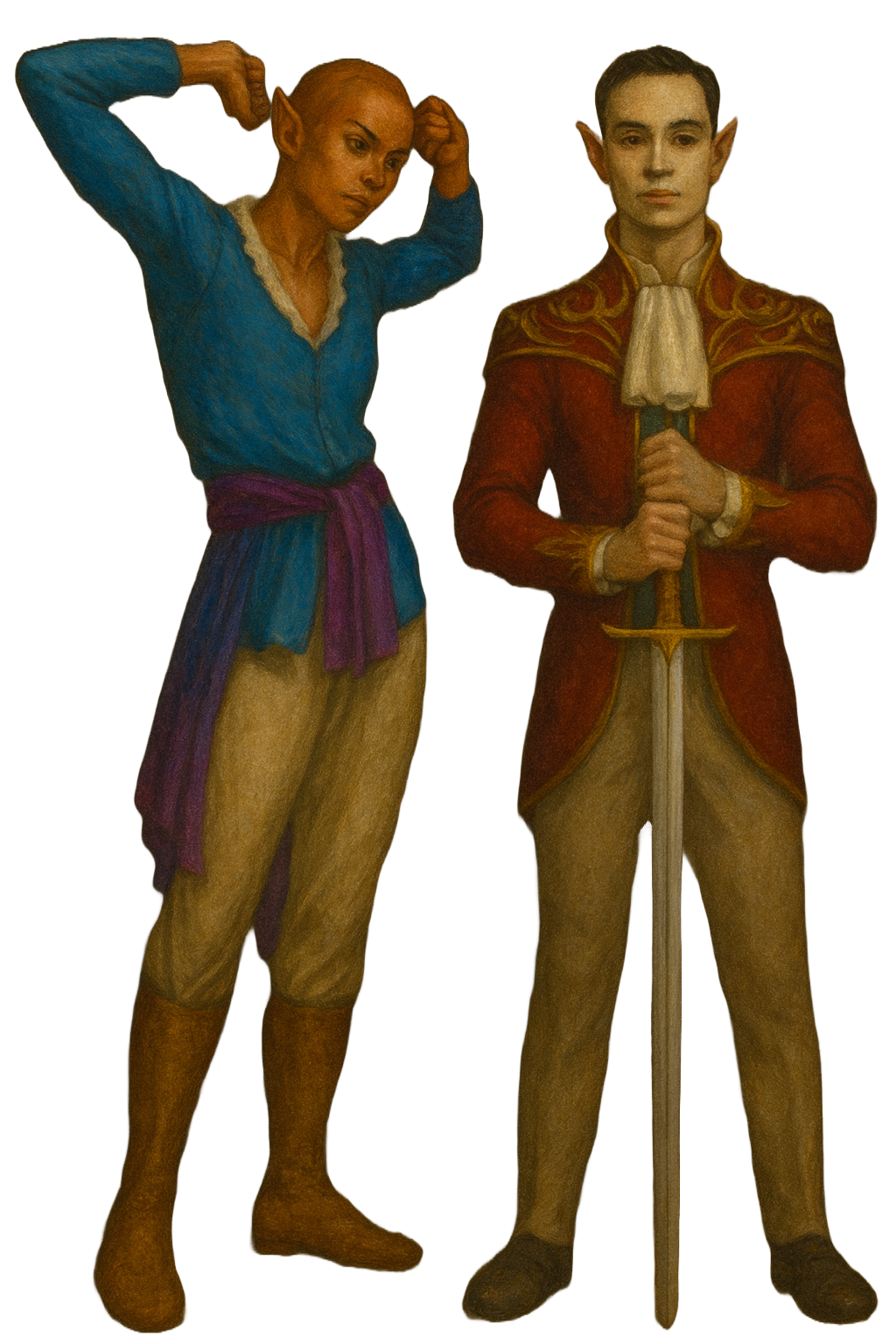 The skin of a blood elf ranges from bright to dark red. They stand between 5’10” to 6’6”. Women are typically shorter and more muscular than the men who are tall and lythe. Their ears come to a slight point at the top as do all elves of Ærethia.
